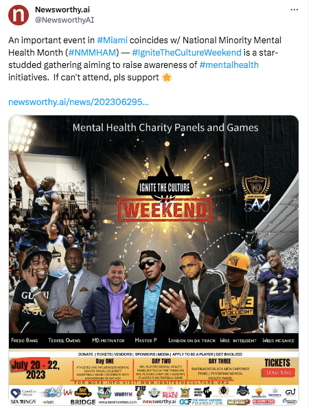 - The highly anticipated "Ignite the Culture" charity event in Pompano, Florida aims to raise awareness and funds for mental health issues, featuring celebrity panels and performances.